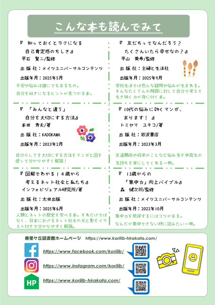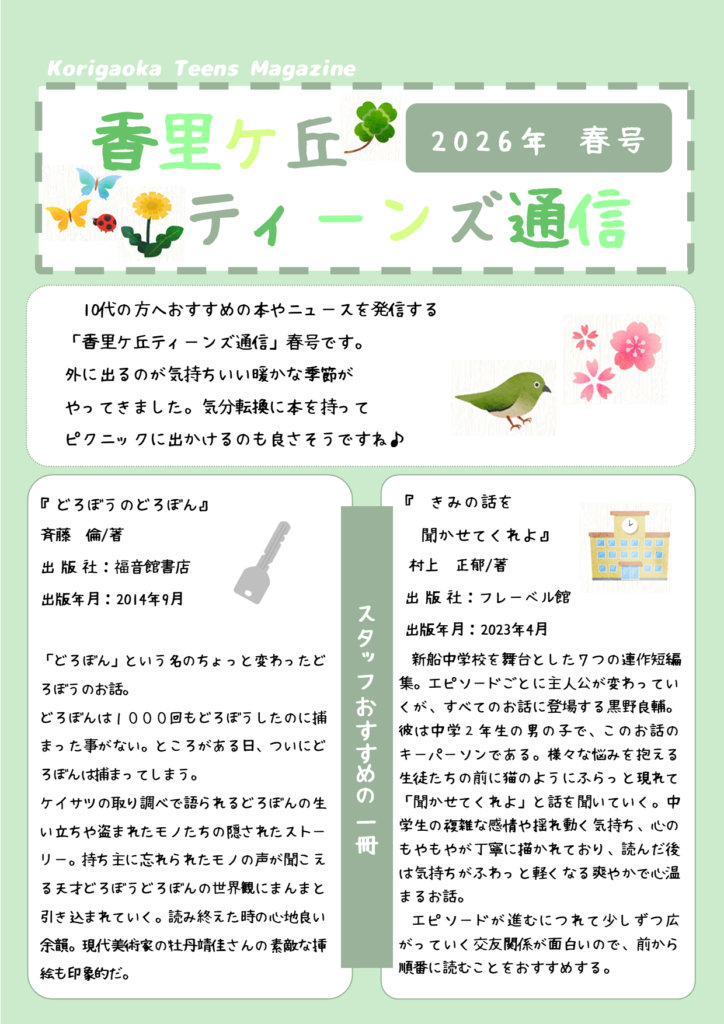 『ティーンズ通信 春号』が発行されました ニュース2026-04-01 19:19:50 10代向け『香里ケ丘ティーンズ通信 春号』を発行しました。下記よりダウンロードしていただけます。 2026ティーンズ通信春号ダウンロード