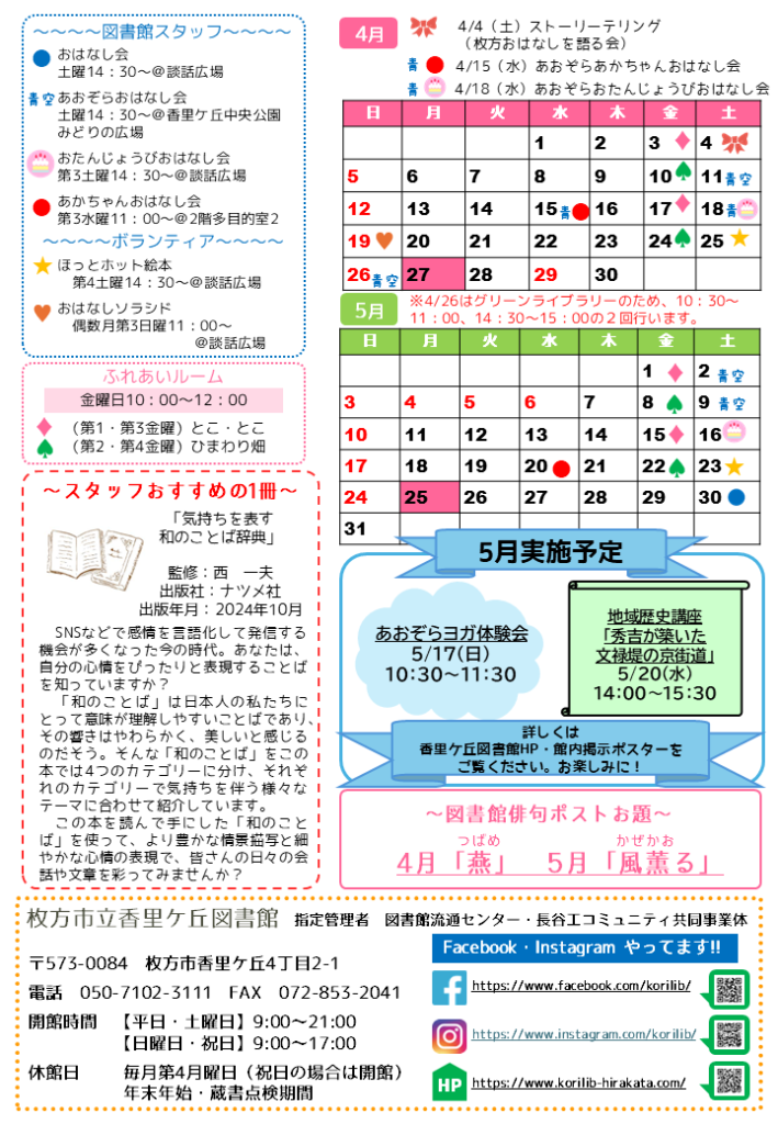 『香里の風』4・5月号が発行されました ニュース2026-03-24 20:53:13 香里ケ丘図書館だより『香里の風』4・5月号が発行されました。下記よりダウンロードしていただけます。 【香里ケ丘図書館】香里の風2026年4・5月号ダウンロード