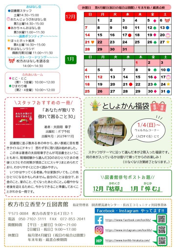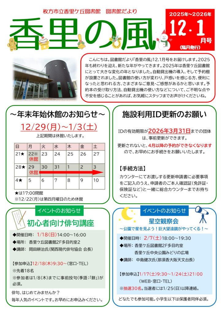 『香里の風』12・1月号が発行されました ニュース2025-12-05 17:02:21 香里ケ丘図書館だより『香里の風』12・1月号が発行されました。下記よりダウンロードしていただけます。 香里の風12.1月号ダウンロード