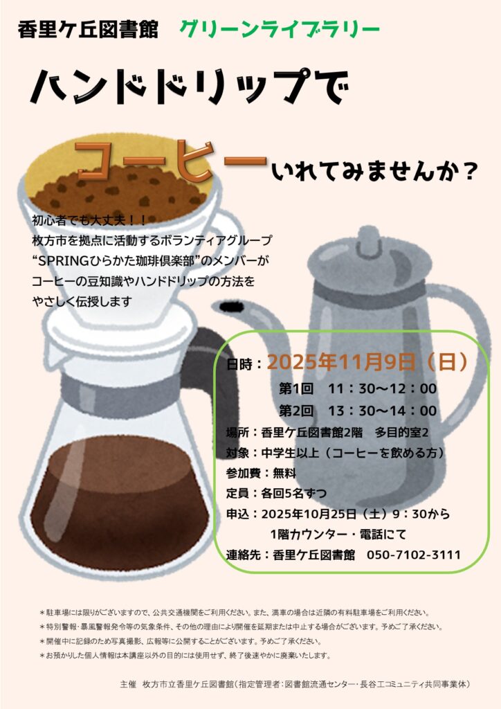 さらに、SPRING(スプリング)ひらかた珈琲倶楽部さんにご協力いただき、先着200名(中学生以上)にハンドドリップコーヒーの無料提供(10:00~15:30)、10名限定でハンドドリップコーヒー体験会(事前申込制)も実施。