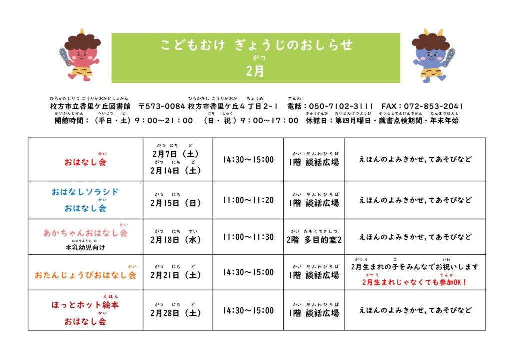 香里ケ丘図書館 2月のこどもむけぎょうじ ニュース2026-02-01 14:00:52 こどもむけぎょうじのおしらせ2月号を発行しました。みなさまのご参加お待ちしております。 ぎょうじ2月ダウンロード